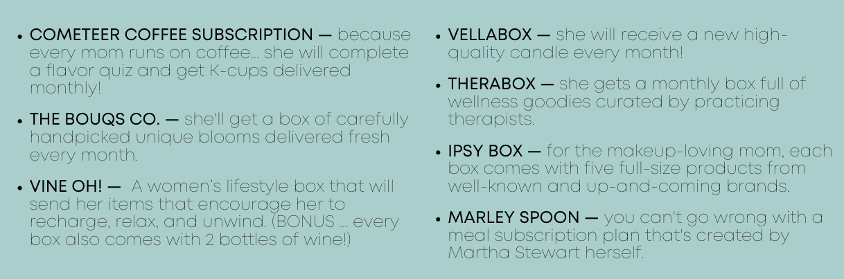 Mother's Day is right around the corner, and if you're a down-to-the-wire shopper scrambling to try and find the perfect gift for Mom ... don't worry, I've got you covered! I've put together a list of the best subscription boxes to help show all the "moms" in your life how much you appreciate their hard work this Mother's Day.